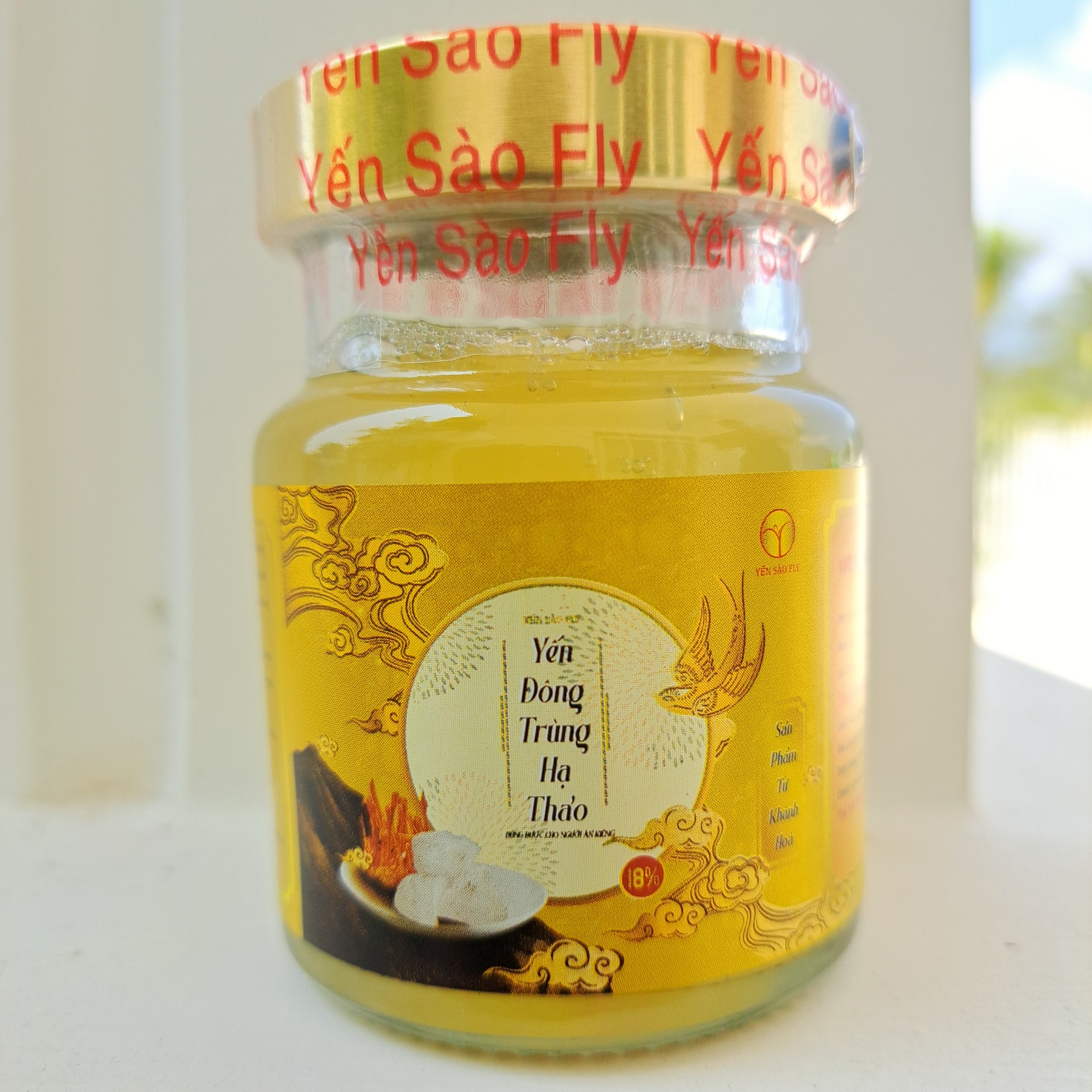 Thành phần: Mỗi lọ 70g chứa: Nước, yến sào 30%, Đông trùng Hạ thảo 15 mg, đường phèn, chất làm dày (INS 401, INS 407, INS 415), chất ổn định (INS 406), chất điều chỉnh độ acid (INS 327), hương liệu tổng hợp (hương yến, hương thảo mộc).